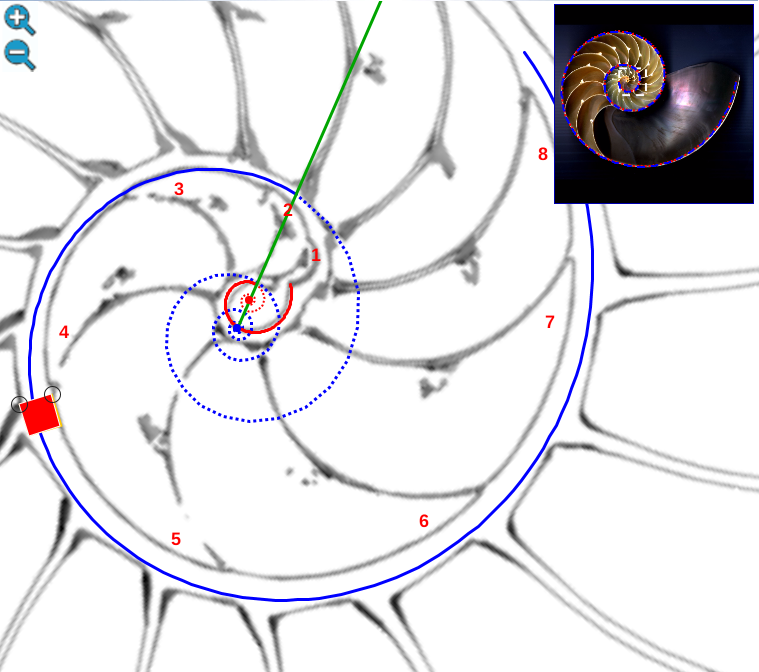 ¡Vaya! Ya lo había adelantado literariamente antes, pero ahora ¡se me hizo irresistible mostrarles gráficamente, en esta figura 21, la causa o germen que permitirá comprender mejor al Nautilus! Bien sabe quien se dedica a investigar que no puede ocultarse la satisfacción cuando en el interior de nuestra mente surge la inspiración ¡Ajá! que sublimó Martin Gardner y la que llevó a Arquimedes a correr desnudo, insconcientemente, a la par que gritaba ¡Eureka! a sus paisanos de Siracusa. Y salvando las distancias y comparaciones, estaba deseoso de que lo vieran. Pero esa inspiración inicial, que esporádicamente regalan las musas generalmente sólo a quien está trabajando, no es más que la piedra angular que asienta y modula la futura estructura global, pero habrá que seguir construyendo sobre ella en base a nuevas inspiraciones y deducciones lógicas. Así pues, hemos de asentar esa piedra base y aplicar todos los detalles detectados, analizados y descritos en la particular revisión que hemos realizado de la ontogenia biologica del Nautilus, para así llegar con paso firme a nuestro objetivo que es poder comunicarles lo que sotto voce nos cuenta el Nautilus acerca de su ser y crecer, y poder hacerle de traductor al lenguaje que muchos catalogan como el criptográfico o secreto de la Naturaleza: el matemático. Ahora sí, llegó el momento esperado, o al menos anunciado, de formular detalladamente la Ontogenia matemática del Nautilus. Gracias por ser pacientes, considero que se verán gratificados por haber llegado aquí y por continuar conmigo.