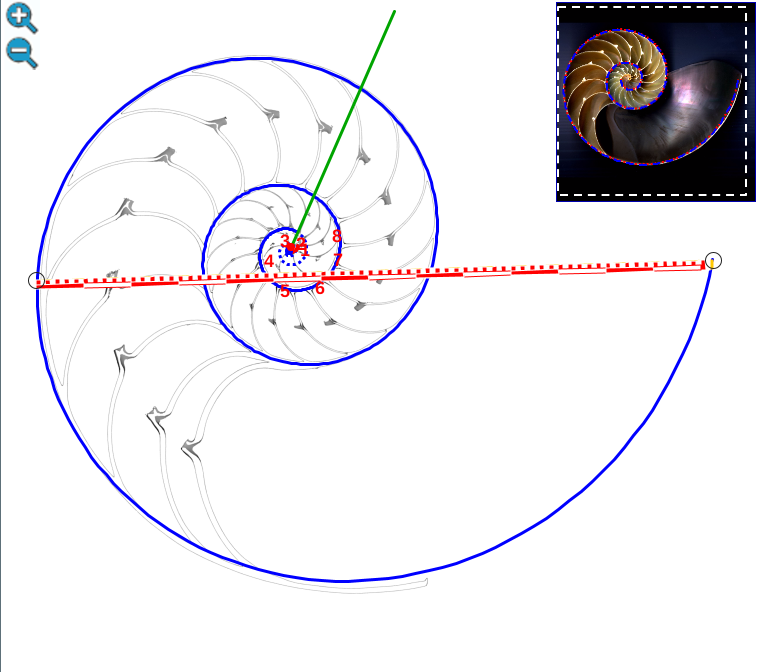 - El polo de la espiral del labio no puede coincidir con el polo de la espiral de la pared ventral ya que el primero ha de ubicarse en el interior del ombligo y el segundo según lo ya modelado se sitúa sobre su borde (ver Fig. 21). Estamos hablando de una distancia entre esos dos polos que estará en el entorno de un milímetro y que puede parecer una diferencia no significativa, sin embargo, como veremos, ésta es realmente la clave diferenciadora y la causa de las variaciones que se observan en el crecimiento durante el primer verticilo respecto al de los restantes. Sí, ¡así es de simple!. A nivel global, a la escala de la concha de un ejemplar maduro, no hay una diferencia visual entre ambas (ver en la esquina superior derecha en la figura 21 que la espiral ventral, en color azul, y la dorsal en rojo se "solapan"), pero a nivel local se contempla un comportamiento muy diferenciado (ver la parte central en esa figura 21), ¡esas son las maravillas de la espiral logarítmica o geométrica o "Spira mirabilis" como la bautizó Jacob Bernoulli.