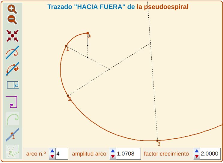 La construcción de la pseudoespiral, o concatenación de arcos de circunferencia, la realizaremos siguiendo las instrucciones de Durero, pero fijando un valor α para la amplitud del arco y otro m para el factor de crecimiento del radio, los mismos para ambos sentidos de la construcción (hacia dentro y hacia fuera). Así pues, emulando a Durero, procederemos de la siguiente forma: