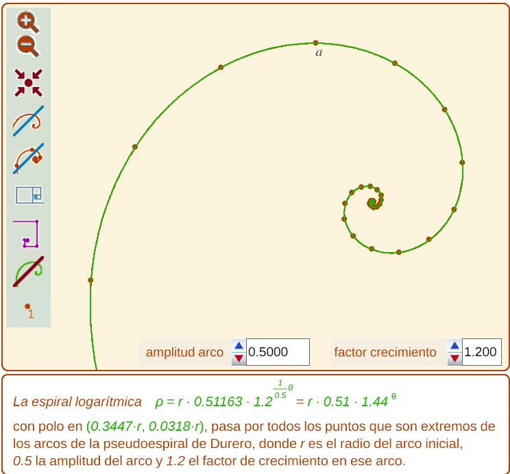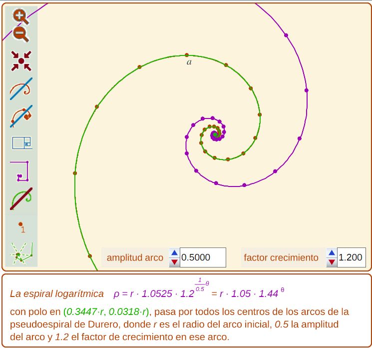 En este nuevo artículo lo que haré es considerar esos dos parámetros, reproducir la construcción atendiendo a sus valores y analizar matemáticamente lo obtenido. Observaremos que para cada pareja de valores de los parámetros obtenemos una pseudoespiral de Durero y que cada una de éstas está ligada a una espiral logarítmica que pasa por todos los puntos extremos de los arcos de la construcción y a una segunda espiral, con igual base, que pasa por todos los centros de esos arcos. Ambas espirales coinciden para una infinidad de esas parejas, es decir, para cada amplitud de arco hay un factor de crecimiento en el que coinciden dichas espirales de puntos extremos y centros y viceversa.