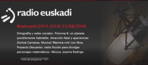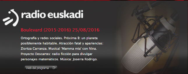 Proyecto Descartes estuvo invitado al programa Boulevard de Radio Euskadi en su emisión del día 25 de agosto, para tratar el tema de la radio ficción en la divulgación de personajes matemáticos.