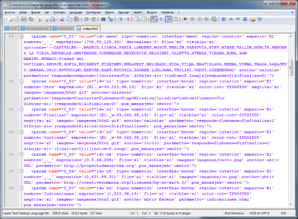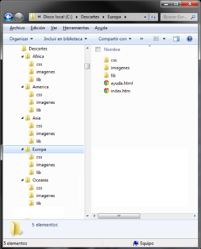 También se comentó acerca de la conveniencia de organizar, de forma eficaz, la información, creando, en el directorio raíz, una carpeta con el nombre "Descartes", y en ella colocar los archivos Descartes.bat y Descartes.jar y, para el proyecto actual, añadir las carpetas: 'Europa', 'Asia', 'Africa', 'America' y 'Oceania'. En cada una de las cinco carpetas anteriores creamos las tres carpetas: 'css', 'imagenes' y 'lib', y dentro de esta última ponemos el archivo descartes-min.js.