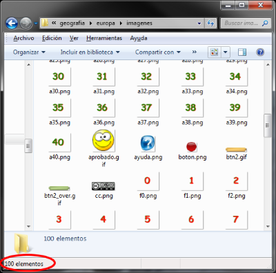 Por último necesitamos contar con todos los elementos auxiliares que van a intervenir en la escena, gráficos, sonidos, vídeos, enlaces, ficheros y demás. En el gráfico siguiente se observa parte del contenido de la carpeta imágenes para el apartado 'Europa' del proyecto. Muchas de estas imágenes se reutilizarán en los siguientes apartados: Asia, África...