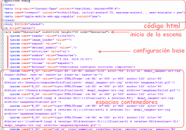 En el vídeo del artículo anterior mostramos como crear los espacios de dos dimensiones: R2 y HTMLIFrame que van a contener a los diversos protagonistas de la escena. En el gráfico inicial se observa el código generado con aquellas acciones. Conviene señalar que se han creado seis espacios, que el principal es el primero, con id = E1, y que en el código todos los espacios comienzan con: <param name=E...