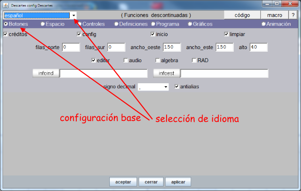también observamos, en la parte superior, un menú desplegable para seleccionar el idioma y una serie de botones: deshacer, rehacer, original, nueva, código, macro y ayuda cuyo significado y uso se explica en documentación técnica y de usuario de Descartes v5.
