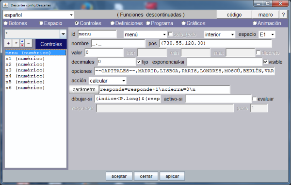 Ahora pasamos a la opción de menú: Controles, aquí definimos los botones, campos de texto, pulsadores etc... que vayamos a necesitar. En nuestro caso particular hemos definido controles para los botones: Otra, Indicaciones,Finalizar y Continuar. También hemos definido dos controles que su única función es contener un gráfico y hemos introducido un cambio respecto al código publicado anteriormente, hemos definido un control tipo menú según muestra esta imagen,