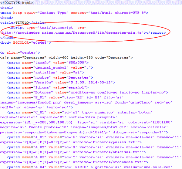 El siguiente gráfico muestra parte de una escena que Juan Guillermo Rivera Berrío incluye en el artículo digital 'Ficheros y Vectores' para la documentación técnica del editor de escenas "Descartes". También se observa la manera de insertar la escena en un documento HTML5 y de enlazar la librería que interpreta, en primera instancia, el código. Así, cualquier navegador compatible con este tipo de documentos mostrará la escena.