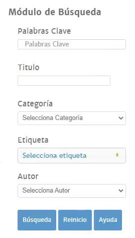 En este módulo se han habilitado cinco elementos que actúan de filtro y se rotulan como Palabras Clave, Título, Categoría, Etiqueta y Autor.