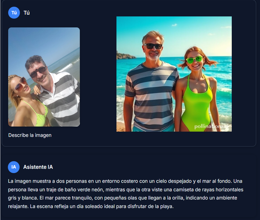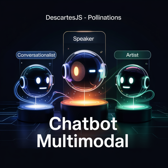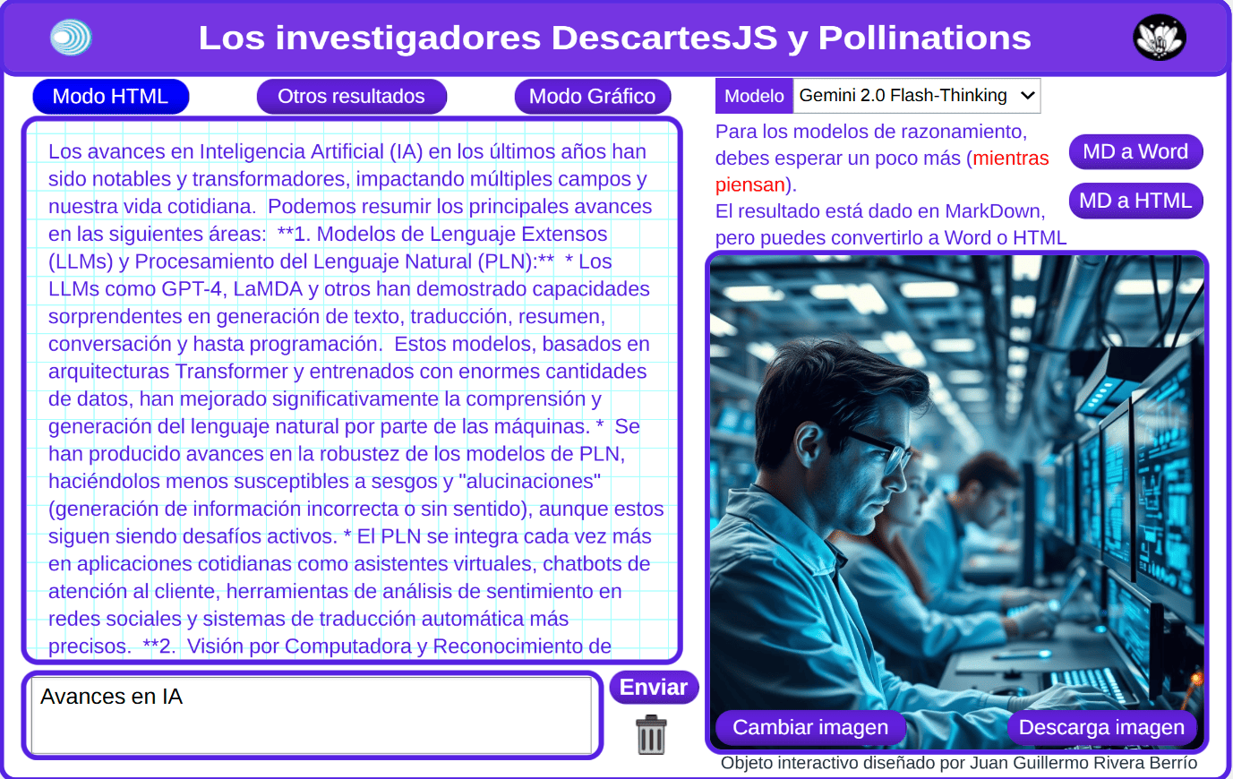 Herramienta de inteligencia artificial multimodal basada en DescartesJS y Pollinations. La interfaz permite a los usuarios ingresar un prompt en un cuadro de texto y recibir respuestas generadas automáticamente. Las respuestas obtenidas son formato audio (mp3), texto (markdown) e imagen (jpg). En resumen, esta herramienta multimodal combina texto, voz e imágenes para ofrecer una experiencia de usuario más completa y enriquecedora, siendo útil en educación, consultas informativas y generación de contenido visual.