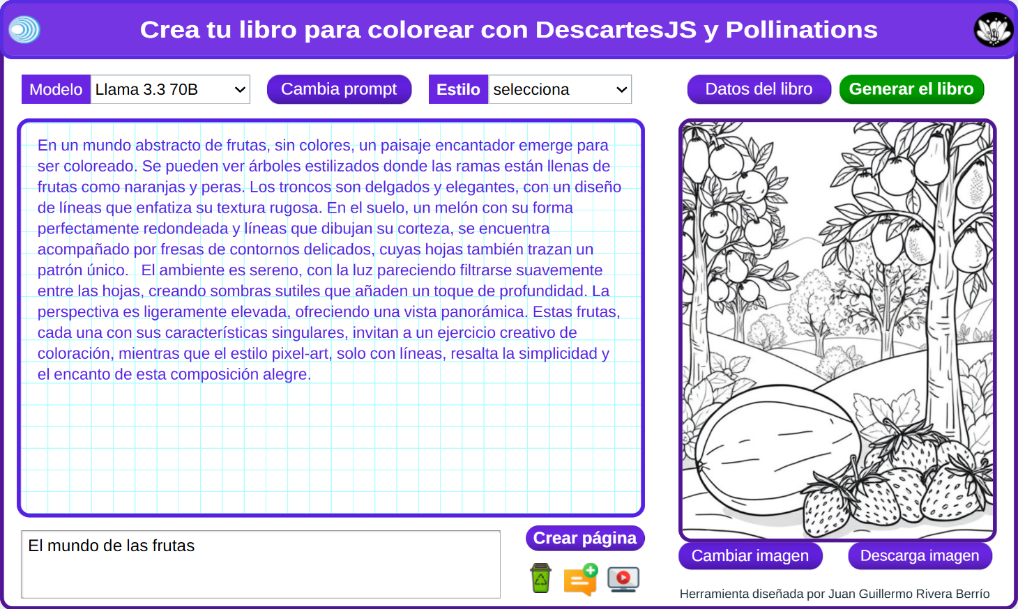 Esta herramienta permite generar imágenes para colorear con el modelo Flux, usando las herramientas Pollinations.ai y DescartesJS, incluye 40 estilos, relación de aspecto configurable y descarga del listado de imágenes para incorporar en presentaciones de diapositivas.  Los presentadsores de diapositivas, se pueden descargar aquí.