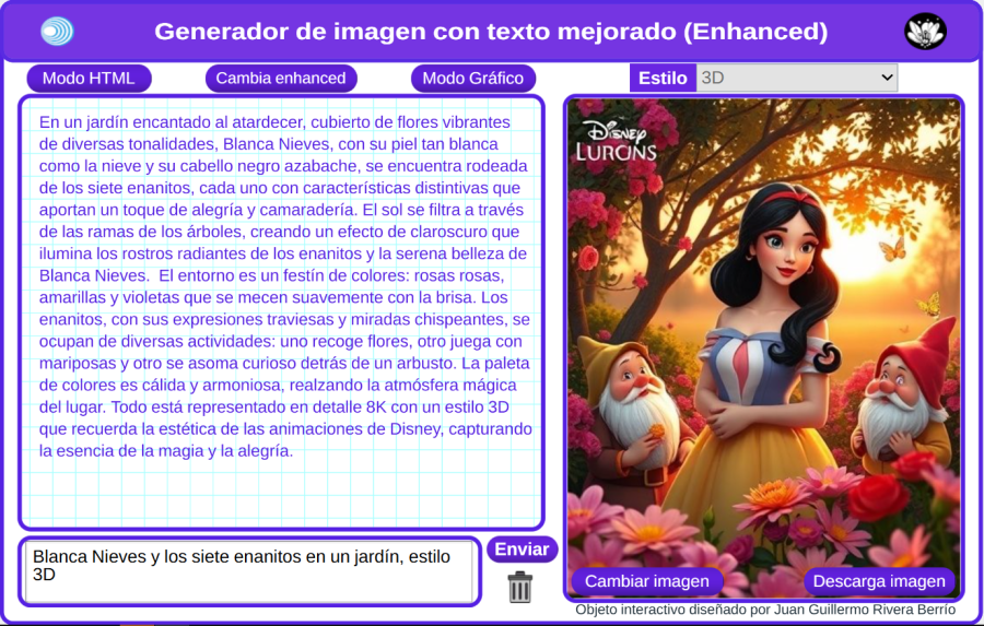 Esta herramienta permite generar imágenes con el modelo Flux y el modelo Image de GPT, usando las herramientas Pollinations.ai y DescartesJS, incluye 40 estilos, relación de aspecto configurable y descarga del listado de imágenes para incorporar en presentaciones de diapositivas. Un tutorial sobre el uso de esta herramienta, se puede ver en este video. Los presentadsores de diapositivas, se pueden descargar aquí.
