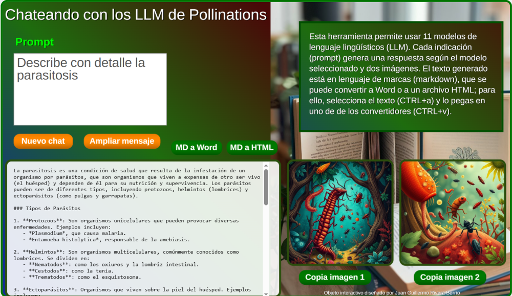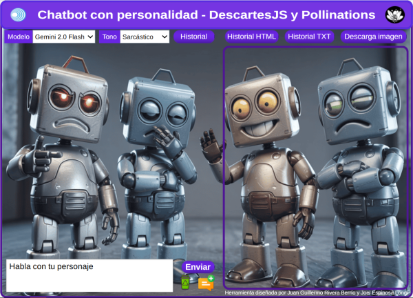 Herramienta de inteligencia artificial tipo ChatBot basada en DescartesJS y Pollinations. La interfaz permite a los usuarios ingresar un prompt en un cuadro de texto y recibir respuestas generadas automáticamente. Incluye, además, imágenes de la plataforma Lexica y la posibilidad de convertir el texto Markdown obtenido en formato Word.