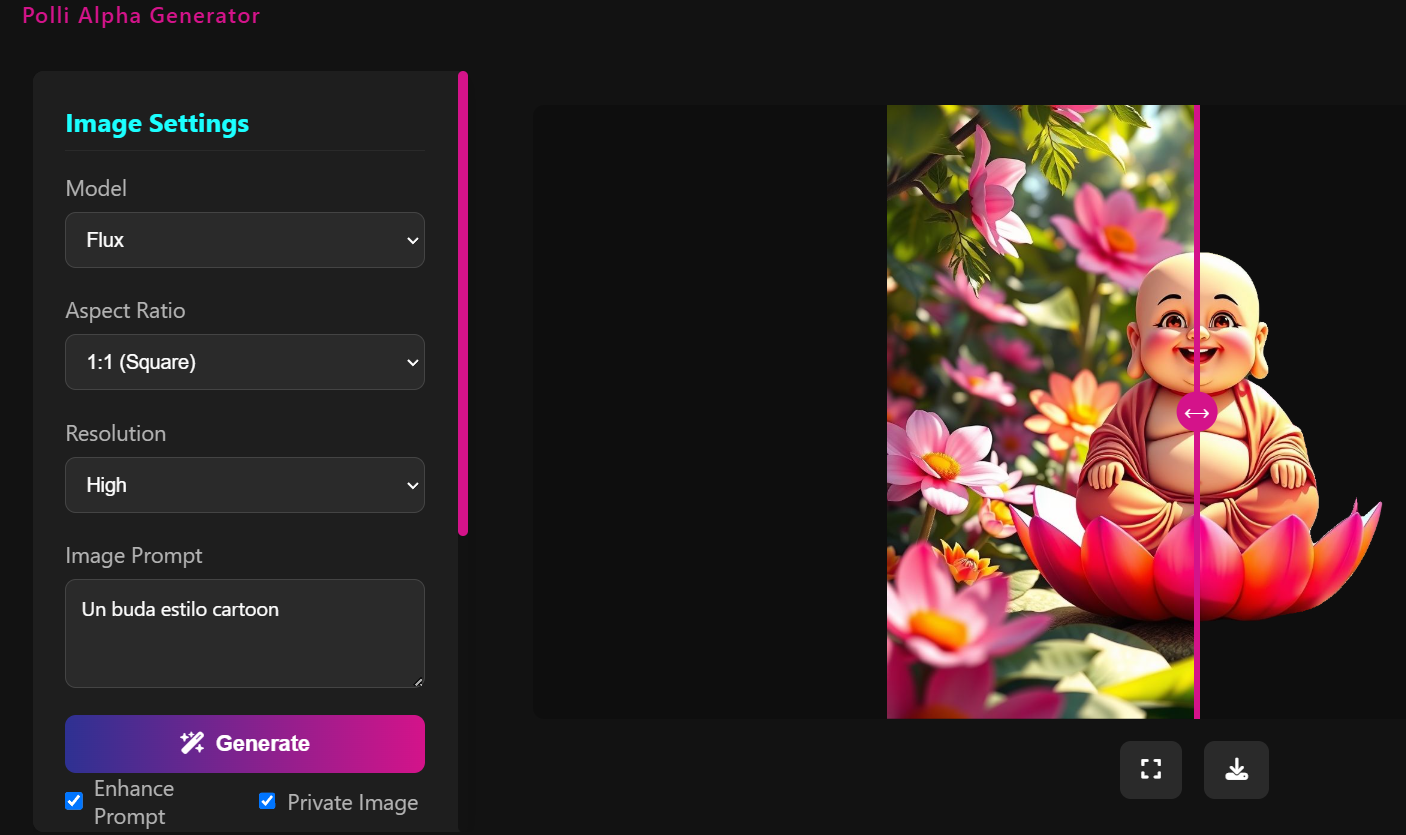 Excelente generador de imágenes que incluye: mejora de prompt (enhance) con un LLM elegido de una lista de más de 10 opciones, más de 200 estilos artísticos y relación de aspecto configurable. La herramienta fue diseñada por el reverendo Dr. Tolerant, también conocido como "Tolerant", usando Pollinations.AI.