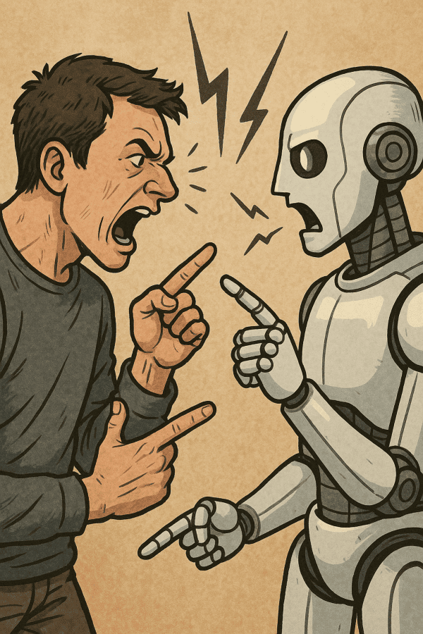 Probamos con la generación de un chatbot, pero fue todo un fiasco. Para no quedarnos si algún resultado, le pedimos que nos dibujar una persona discutiendo con un bot, luego de varias imágenes, bastante violentas, optamos por compartir la siguiente: