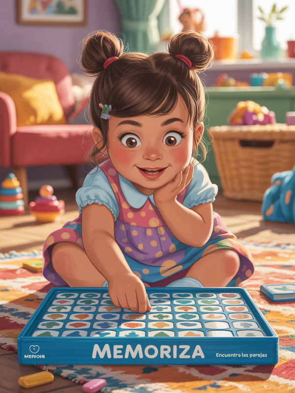 La imagen muestra un ambiente infantil acogedor donde una niña juega a un juego de memoria sobre una alfombra de colores vibrantes. La niña tiene el pelo recogido en dos moños sujetos con gomas rojas y lleva un vestido corto de manga azul claro, con un delantal púrpura decorado con puntos amarillos. Está sentada en el suelo, interactuando con un juego de mesa azul llamado "MEMORIZA" (con la leyenda "Encuentra las parejas" debajo), que tiene cuadrados con diferentes figuras coloreadas.