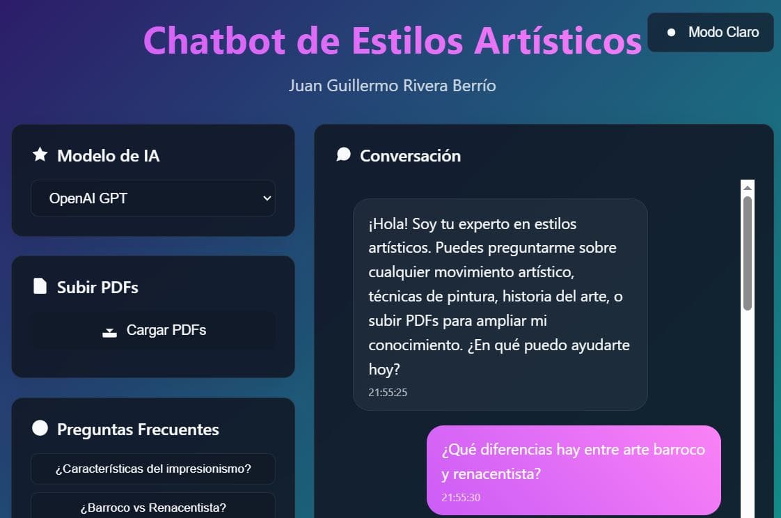 Con el mismo prompt que usamos con Claude 4 (página 16), creamos un chatbot sobre estilos artísticos (haz clic sobre la imagen):