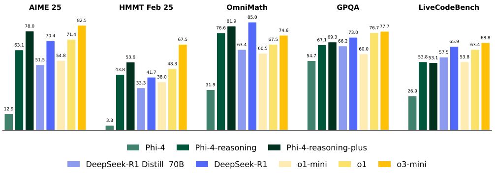 Ambos modelos superan significativamente a modelos de mayor tamaño, como DeepSeek-R1-Distill-Llama-70B, en diversas tareas de razonamiento. En benchmarks como AIME 2025 y OmniMath, Phi-4-reasoning-plus muestra mejoras de más de 50 puntos porcentuales en precisión. En tareas de codificación, se observan mejoras de más de 25 puntos porcentuales (véase el reporte técnico en arXiv:2504.21318).