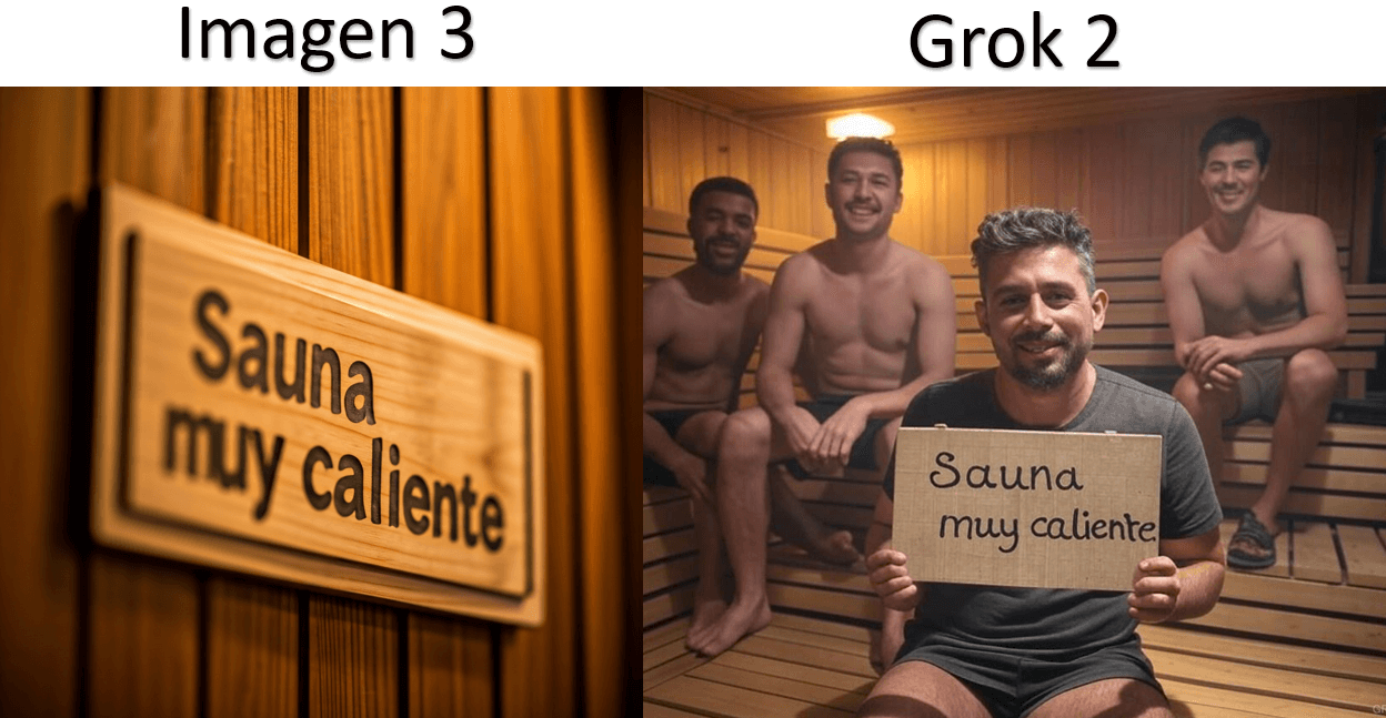 Un primer problema que detectamos en Imagen 3, es el sesgo presentado para generar imágenes con personas, por lo que en el prompt "un sauna con cuatro personas y un texto que dice 'Sauna muy caliente'", tuvimos que quitar "con cuatro personas" para generar la imagen con Imagen 3Google ha anunciado "Pronto se podrán generar imágenes de personas en Gemini Advanced."..
