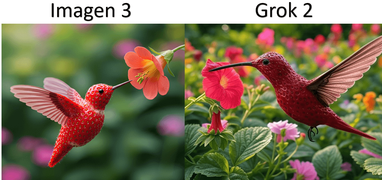 Un primer ejercicio fue compararlas con el prompt: "A close-up, macro photography stock photo of a strawberry intricately sculpted into the shape of a hummingbird in mid-flight, its wings a blur as it sips nectar from a vibrant, tubular flower. The backdrop features a lush, colorful garden with a soft, bokeh effect, creating a dreamlike atmosphere. The image is exceptionally detailed and captured with a shallow depth of field, ensuring a razor-sharp focus on the strawberry-hummingbird and gentle fading of the background. The high resolution, professional photographers style, and soft lighting illuminate the scene in a very detailed manner, professional color grading amplifies the vibrant colors and creates an image with exceptional clarity. The depth of field makes the hummingbird and flower stand out starkly against the bokeh background":