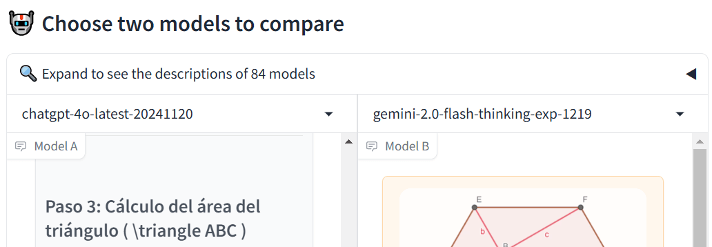 Hicimos, también, el ejercicio en el chat arena, con chatgpt-4o-latest-20241120 y gemini-2.0-flash-thinking-exp-1219, ambos con respuestas equivocadas.