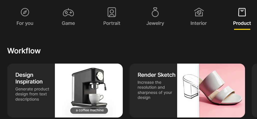 En dzine, como lo dijimos en el apartado anterior, podemos usar la herramienta Image to Image, para el renderizado de bocetos o, si se prefiere, en la opción Product, seleccionamos la opción Render sketch.