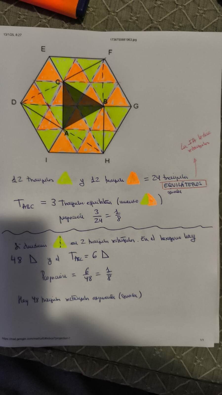 Un razonamiento con los 24 triángulos congruentes frente a los tres. Pero son equiláteros (no rectángulos como dice la IA) O 48 rectángulos frente a 6.