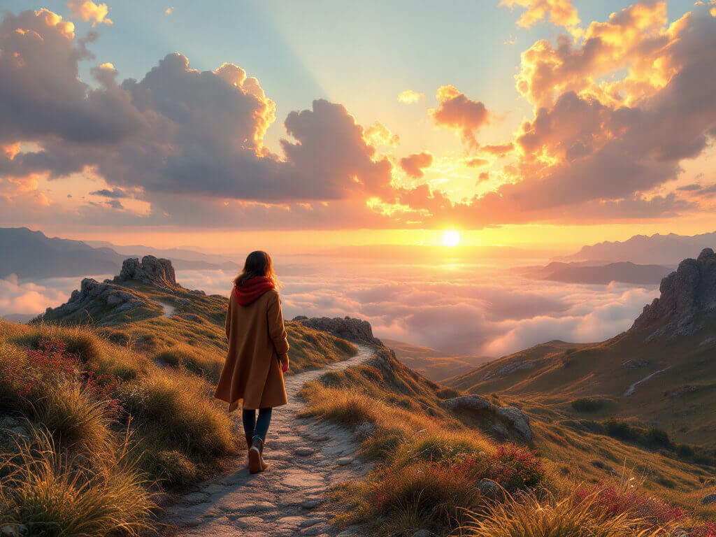 Un amanecer radiante ilumina un amplio paisaje con un cielo en tonos cálidos de naranja, dorado y rosa. En primer plano, una joven de cabello suelto, vestida con un abrigo ligero y una bufanda, está de pie al borde de un sendero serpenteante cubierto de rocío. Ella mira hacia el horizonte con una expresión de esperanza y determinación, sosteniendo un diario o un libro en sus manos, simbolizando sus planes para el futuro. A su alrededor, pequeñas flores de invierno comienzan a brotar del suelo, representando nuevos comienzos. En el fondo, montañas suaves y un valle iluminado por los primeros rayos del sol completan la escena. Todo el ambiente es sereno, fresco y lleno de posibilidades, con un estilo realista y detalles cuidadosos en la luz y el paisaje