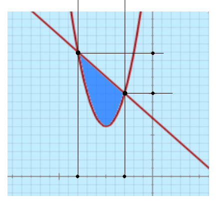 Se debe hallar los puntos de corte entre las funciones, para esto, se igualan las funciones y se hallan los valores de $x$: $$7-x=x^2+10x+31$$ $$x^2+11x+24=0$$ $$(x+8)(x+3)=0$$ por lo tanto, $x=-8, x=-3$ $$ A=\int_{a}^{b} (f(x)-g(x))\, dx $$ $$ A=\int_{-3}^{-8} (7-x-(x^2+10x+31))\, dx $$ $\begin{aligned} A=\int_{-3}^{-8} (-x^2-11x-24)\, dx &= -\frac{x^3}{3}-\frac{11}{2}x^2-24x \space\space \bigg|_{-3}^{8} \\ &= \frac{63}{2}-\frac{32}{3}=\frac{125}{6}\\ \end{aligned}$