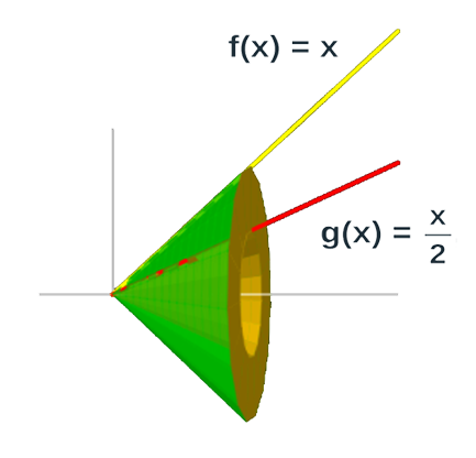 $f(x)=x$ y $\displaystyle g(x)= \frac{x}{2}$,