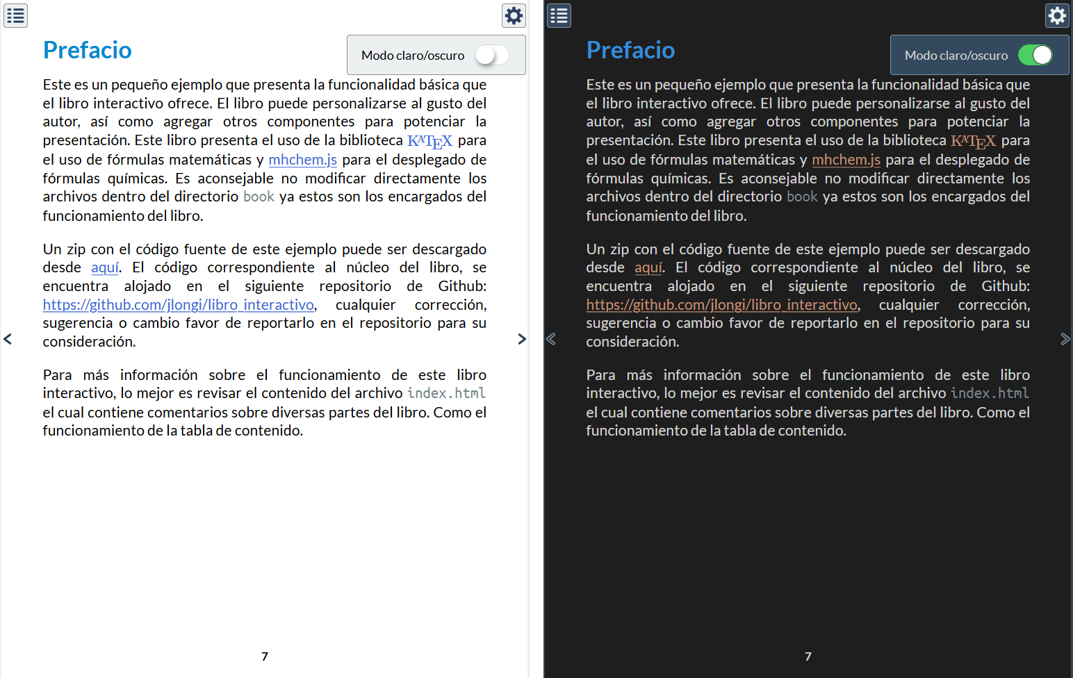 El libro cuenta con colores predeterminados para su presentación y si no se agregan reglas adicionales de estilo CSS, el cambio entre el tema claro y oscuro no requiere de ningún cambio adicional por parte del autor.