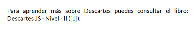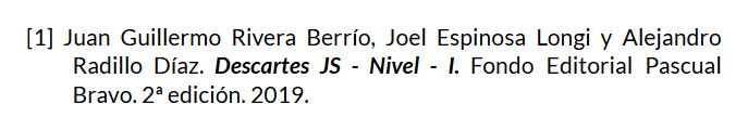 Para agregar una entrada a la bibliografía se utiliza la etiqueta <bibitem>, con la que se especifican los diferentes apartados de una fuente bibliografía, como el autor y el título. Por ejemplo para agregar la información bibliográfica del libro “Descartes JS - Nivel - I”, escribiremos lo siguiente: