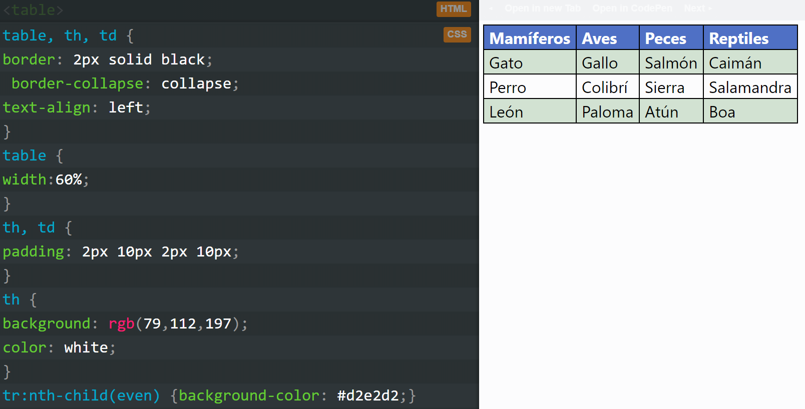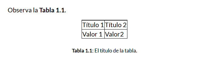 Así como es posible incluir figuras autonumeradas dentro de nuestro libro, también tenemos la posibilidad de incluir tablas autoenumeradas. El mecanismo es idéntico al de las figuras, es decir, utilizar el elemento <figure> e incluir dentro la tabla junto con un elemento <figcation> para la etiqueta de la figura; la única diferencia es que hay que agregar la clase figtable al elemento <figure>, para que así el libro conozca que se trata de una tabla y no de una figura. Por ejemplo a partir del siguiente código: