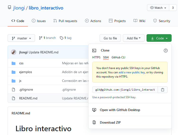 El código del núcleo del libro interactivo se encuentra alojado en el repositorio de código GitHub (https://github.com/jlongi/libro_interactivo) desde donde se puede descargar y acceder a ejemplos básicos de funcionamiento.