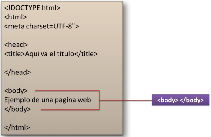 La etiqueta <body> es el cuerpo del documento, que contiene los elementos visibles en la página: las imágenes, los encabezados, los párrafos de texto, las listas, las tablas, los hipervínculos, escenas de Descartes, etcétera. Los documentos HTML deben tener la extensión html o htm para que puedan ser reconocidos por un navegador.