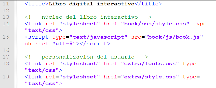 El código correspondiente al núcleoEl código JavaScript y estilo CSS que utiliza el libro para dar el comportamiento y la presentación al documento, por ejemplo, la presentación páginada del contenido, y la autonumeración de los diversos elementos. del libro es la información contenida dentro del directorio book/ de la estructura de archivos de nuestro documento. La recomendación general es no modificar los archivos contenidos en este directorio, ya que son los archivos que se actualizan con cada nueva versión del núcleo del libro; y solo debería modificarse si se va a actualizar a una nueva versión.
