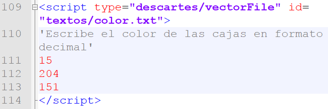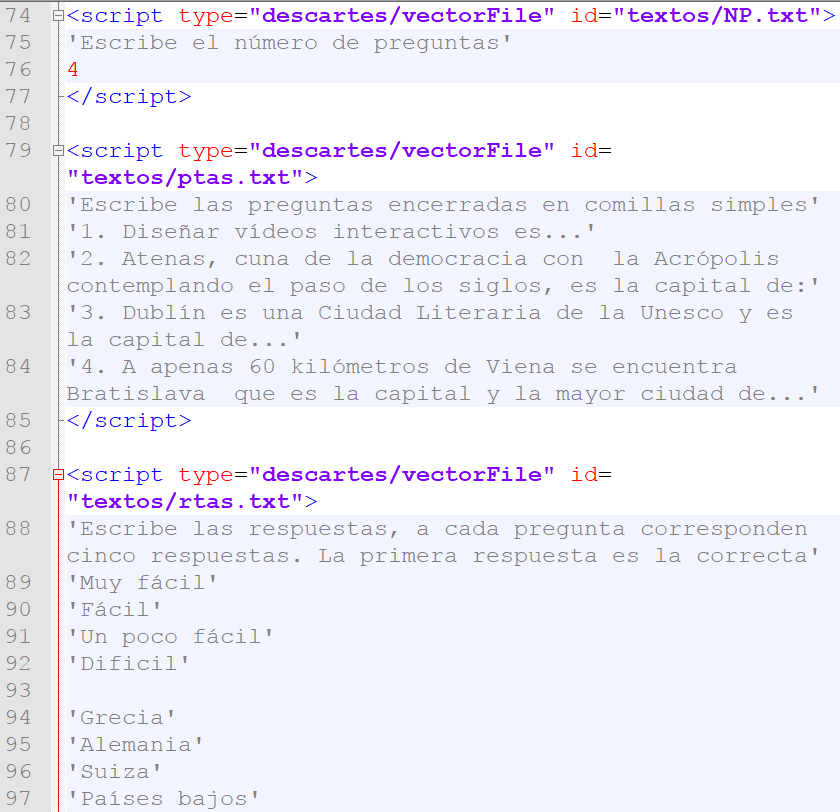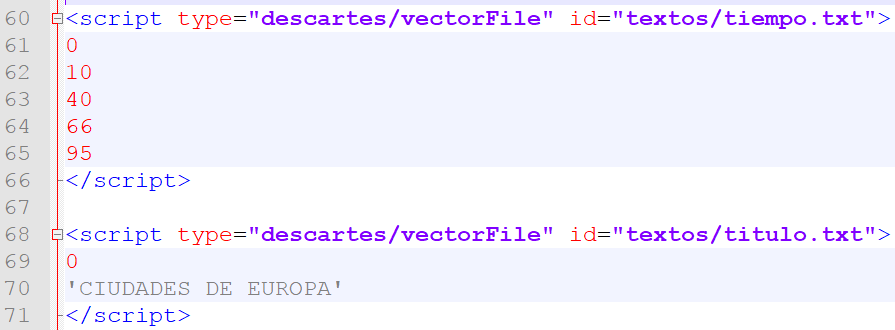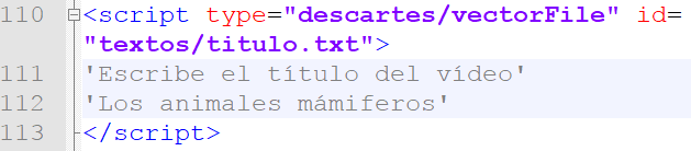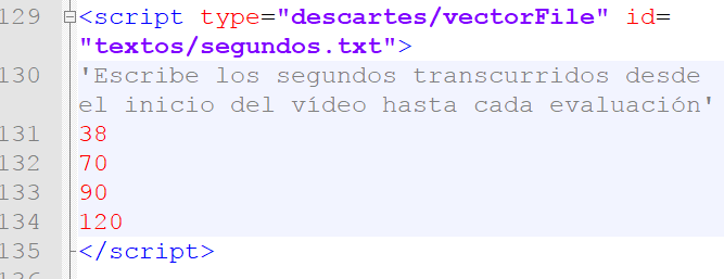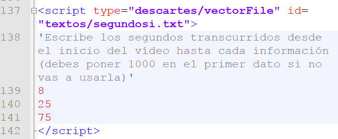 Tiempos de parada para mostrar las actividades interactivas. En el <script> que contiene los datos del archivo segundosa.txt escribes los tiempos de parada para mostrar las actividades interactivas. Para nuestro ejemplo, hay dos escenas interactivas y, en consecuencia, dos datos en el <script>. Recuerda cambiar el primer dato por un valor de 1000, si no deseas incluir este tipo de evento.