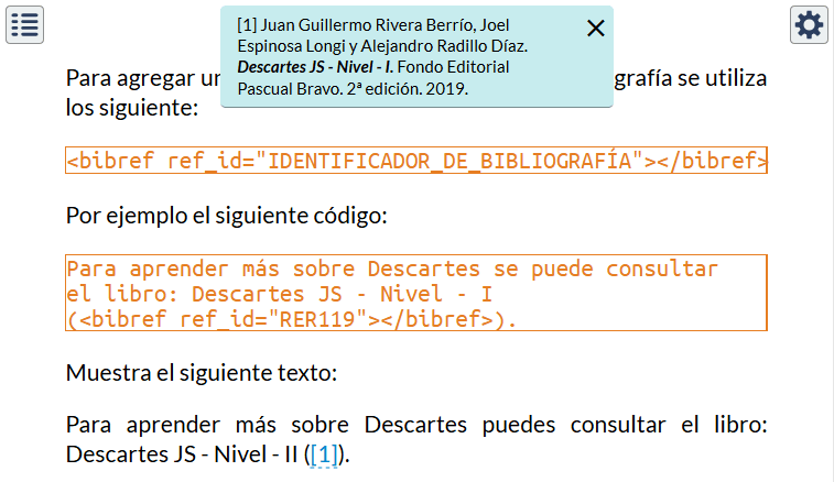 Además de destacar la referencia, este elemento tiene la funcionalidad de que al ser presionado (como si fuera un botón), muestra en la parte superior del libro la información de la entrada bibliográfica.