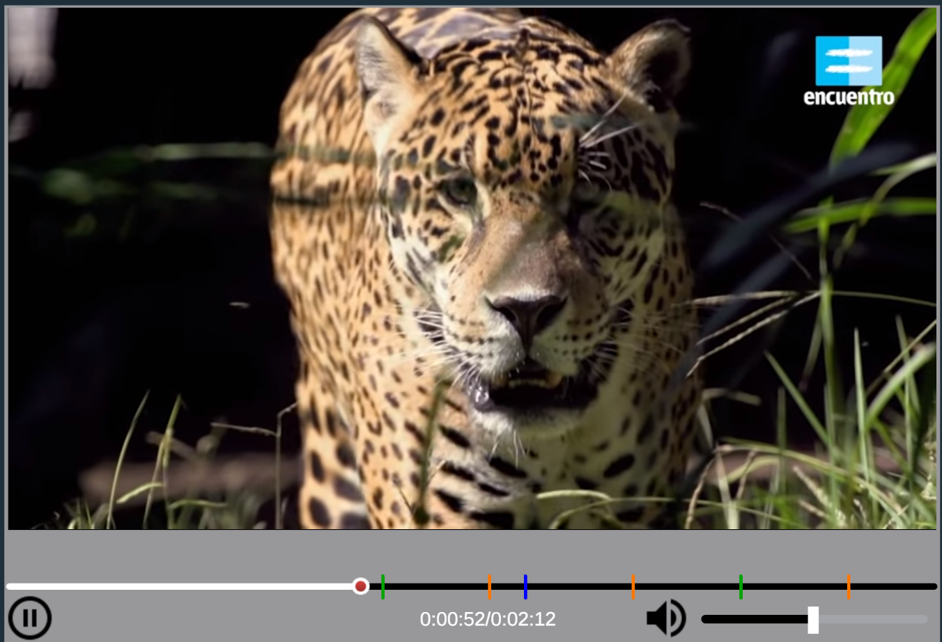 Los tres tipos de actividades se presentarán durante la reproducción del vídeo, las cuales se identifican con una marca azul (información), naranja (evaluación) o verde (actividad interactiva), tal como se muestra en la siguiente imagen:
