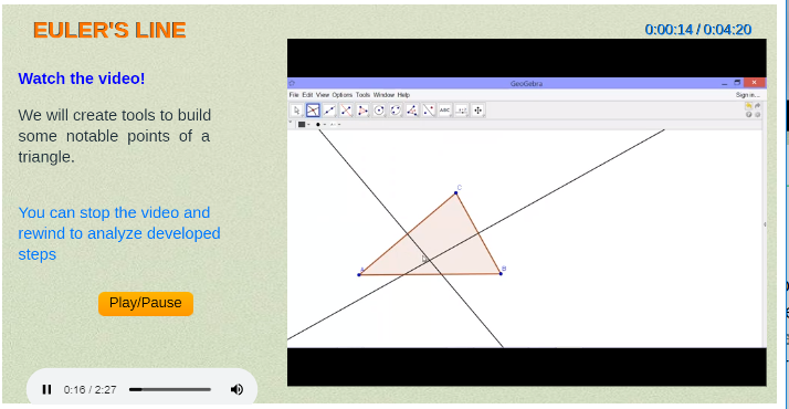 Presentamos algunos ejemplos usando la herramienta GeoGebra, en los cuales se presentan suspensiones del vídeo, de tal forma que se practique lo explicado en el vídeo (haz clic sobre cada imagen para observarlos).