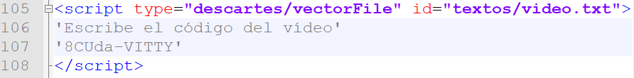 Código YouTube del vídeo. Corresponde al vídeo que seleccionaste para interactuar con el. Debes anotar el código, tal como lo hicimos en el anterior. Al final del archivo, en el primer <script> escribes este código entre comillas simples, que para nuestro vídeo de animales es 8CUda-VITTY.