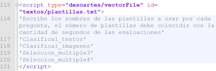 Plantillas a usar para los eventos de evaluación. ¿Recuerdas el archivo index2.html del primer modelo?, esa podría ser una plantilla a usar; sin embargo, puedes seleccionar nuchas otras del Proyecto Plantillas o, si lo prefieres, de otras plataformas como GeoGebra. Una vez las hallas seleccionado y modificado de acuerdo a tu vídeo, debes incluirlas en el <script> que contiene el archivo plantillas.txt. Para nuestro ejemplo, hemos seleccionado del plantillero: “Clasifica textos en dos contenedores”, “Clasifica imágenes en dos contenedores”, “Selección múltiple Identifica textos” y “Selección múltiple Identifica imágenes”.