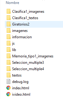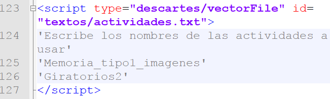 Actividades interactivas complementarias. Es posible incluir escenas de DescartesJS, GeoGebra, Phet, etc. Para nuestro ejemplo, hemos escogido del proyecto Plantillas dos puzles, uno tipo memoriza y el de giratorios. Los nombres de las carpetas de estas escenas interactivas deben ir en el <script> que contiene el archivo actividades.txt.