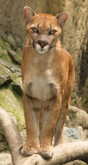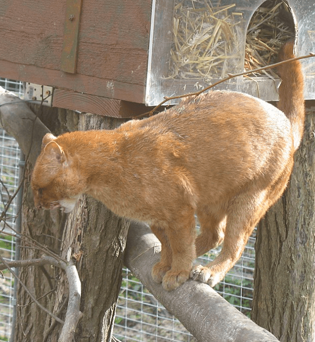 Su constitución se asemeja en general a la del puma, aunque a diferencia de este, su talla es muy inferior, posee orejas más pequeñas, forma más alargada, patas más cortas y sus colores son más variados (rojizos, negros, grises claro y oscuro); al igual que en el puma, su color es siempre uniforme, sin manchas (Wikipedia).