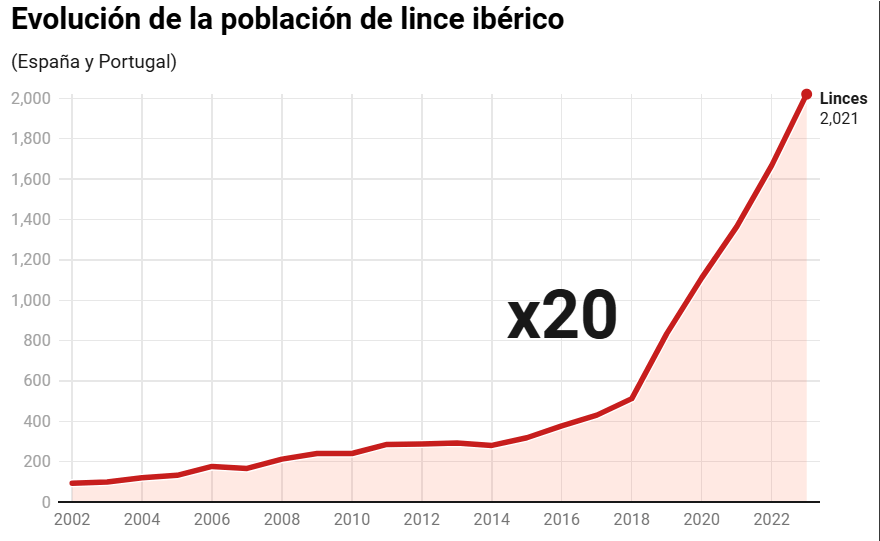 Los esfuerzos de conservación han logrado algunos éxitos notables. Por ejemplo, la población de lince ibérico ha aumentado de menos de 100 individuos en 2002 a más de 1000 en 2020. En 2024, el nuevo censo de lince ibérico presenta la cifra de 2021 ejemplares. El censo demuestra que el trabajo conjunto realizado hasta el momento por todos los actores implicados en su conservación está dando sus frutos y acerca a esta especie a los objetivos de alcanzar las 750 hembras y entre 3000 3500 ejemplares, para considerar al lince de forma definitiva una especie fuera de peligro (WWF).