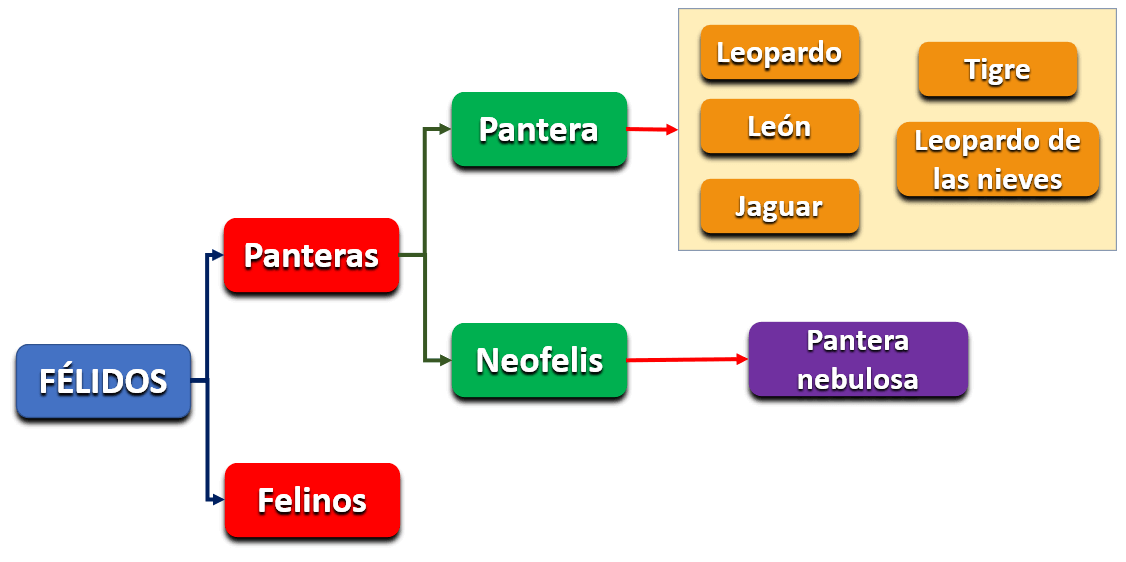 Actualmente, la familia Felidae está constituida por dos subfamilias: Panteras (Pantherinae) y Felinos (Felinae). De la primera subfamilia, hemos descrito los miembros del género Pantera, faltando el género Neofelis, del cual hablaremos de las panteras nebulosas.