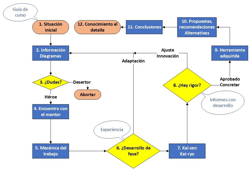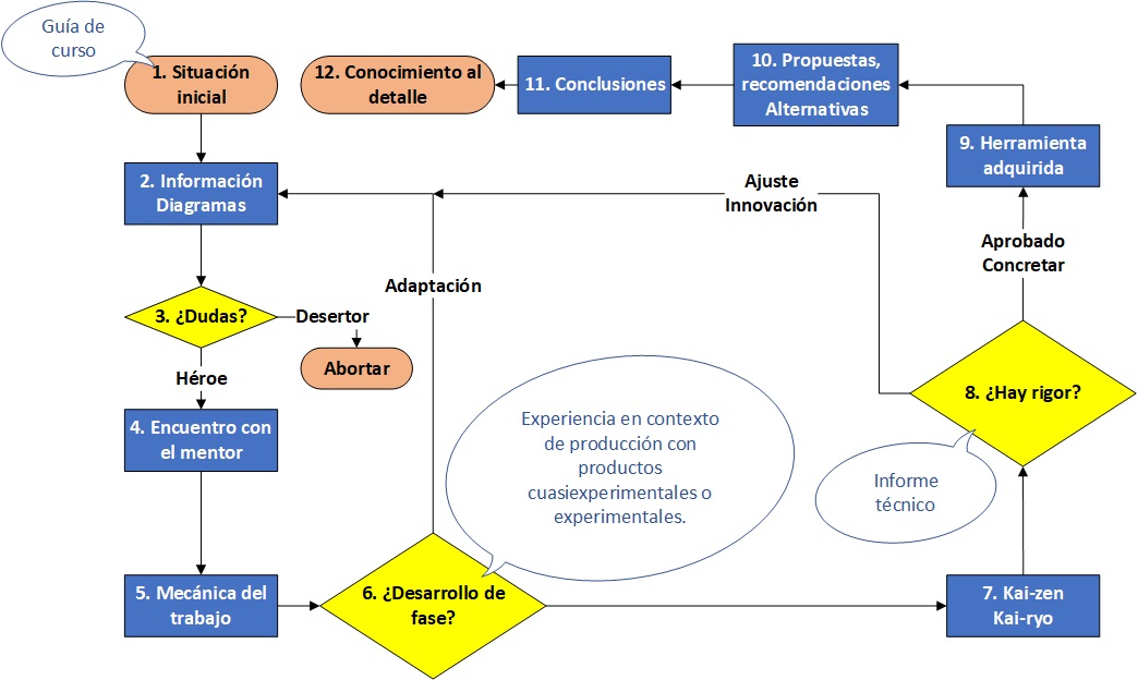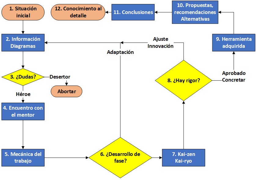Habiendo seguido los pasos, se ha compartido el diagrama de flujo que da una ruta, las figuras en color amarillo son de decisión en caso de requerirse llevan a retornar y hacer ajustes, los elementos en azul son actividades y las restantes son de apertura o cierre del proceso total. Una característica particular en la concepción teórica de Joseph Campbell, es que en tres (3), el estudiante que lo supera, siempre termina con un conocimiento al detalle hasta llegar al paso 12.