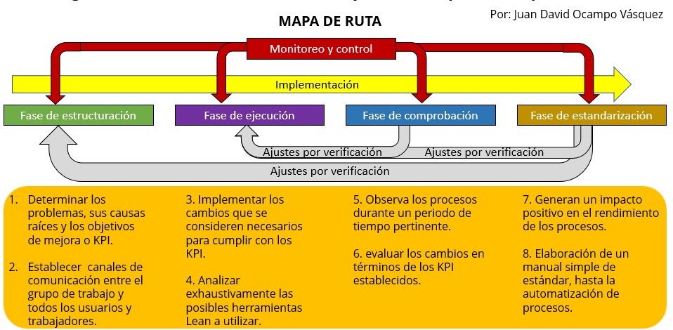 Es probable a partir de la hoja de ruta complementar con herramientas VSM, 5S, selección de proyectos lean, project chapter hacer una ruta lean que relacione fase de estructuración y ejecución; avanzado con la comprobación por modelos de producción y gerencia de producción para finalmente entrar en la fase de estandarización con propuestas o planes de acción y en su defecto informes técnicos que aporten al desarrollo de mejoras en las empresas, emprendimientos y organizaciones de tejido social en general.