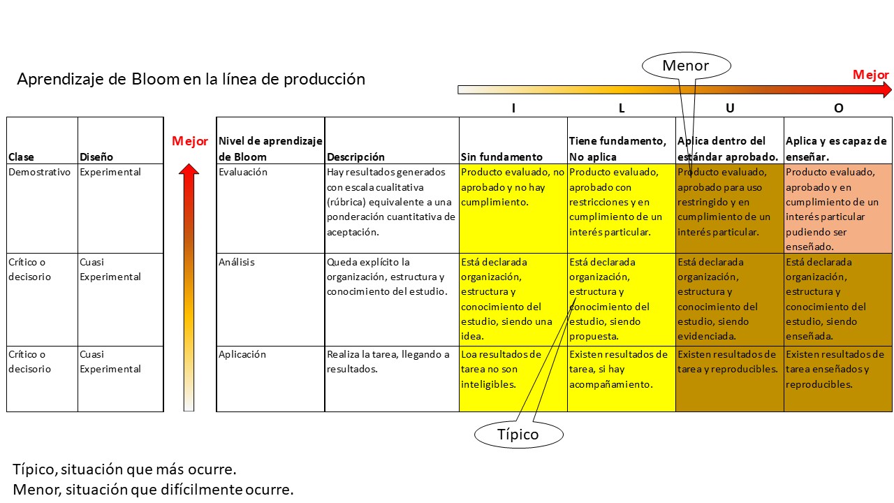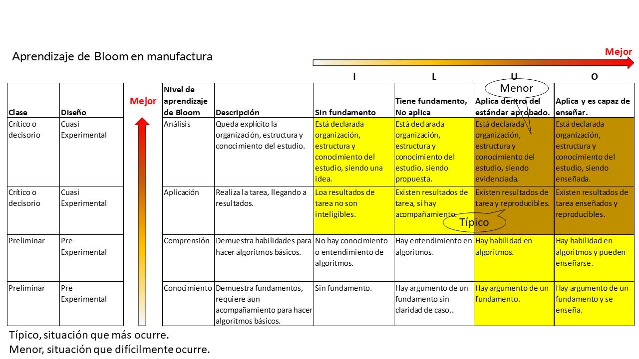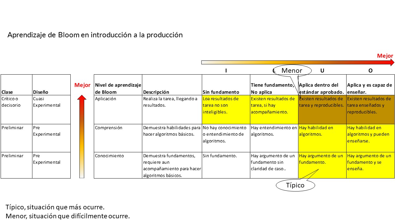 • Aprendizaje de bloom, En una mirada de la matriz los participantes deben haber tenido un conocimiento previo de procesos, operaciones, actividad en contexto productivo desde la componente de la empresa (1) pyme, (2) mipyme o (3) gran industria, recordando que según datos de DANE y ACOPI el 92% en Colombia están en una oportunidad del tipo 1 y 2. Por esto crecer en esta área se convierte en la opción de productos con propuesto, probados por modelación o pruebas de valor en el mercado.