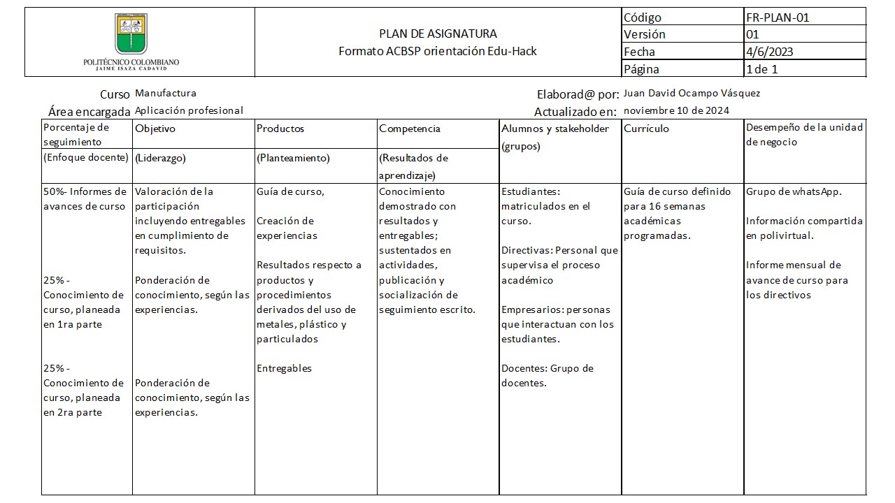 Acuerdo Consejo Directivo 03 del 13 de marzo (2024). Estatuto Docente que regula las condiciones de los profesores al servicio del Politécnico Colombiano Jaime Isaza Cadavid, Institución Universitaria. Acuerdos directivos [En línea]. Disponible en: Estatuto profesora, Politécnico Colombiano Jaime Isaza Cadavid. Martín-Salinas, Carmen & Cid-Galán, M. Luisa (2018). Experiencia de aprendizaje cooperativo en una asignatura optativa del Grado en Enfermería. Educación Médica. Volume 19, Issue 5, September–October 2018, Pages 288-293 [En línea]. Disponible en: Experiencia de parendizaje cooperativo en una asignatura optativa. Gómez-Luna, Eduardo; Fernando-Navas, Diego; Aponte-Mayor, Guillermo; Betancourt-Buitrago, Luis Andrés (2014). Metodología para la revisión bibliográfica y la gestión de información de temas científicos, a través de su estructuración y sistematización. Dyna. vol. 81, núm. 184, abril, 2014, pp. 158-163 [En línea]. Disponible en: Dina, Universidad Nacional de Colombia. Da Costa Pimenta, Clayson Cosme (2021).El nuevo paradigma de la economía circular. El caso de Colombia. Cooperativismo & Desarrollo. vol. 30, núm. 124, pp. 1-19 [En línea]. Disponible en: Ejemplo de artículo de revisión bibliográfica. Revista Cooperativismo & desarrollo (2024).Plantilla para el autor. Cooperativismo & Desarrollo. [En línea]. Disponible en: Plantilla con recomendaciones para el autor. Groover, Mikell P. (2007).Fundamentos de manufactura moderna. Prentice-hall. [En línea]. Disponible en: Manufactura moderna, sujeto a disponibilidad en el sitio.
