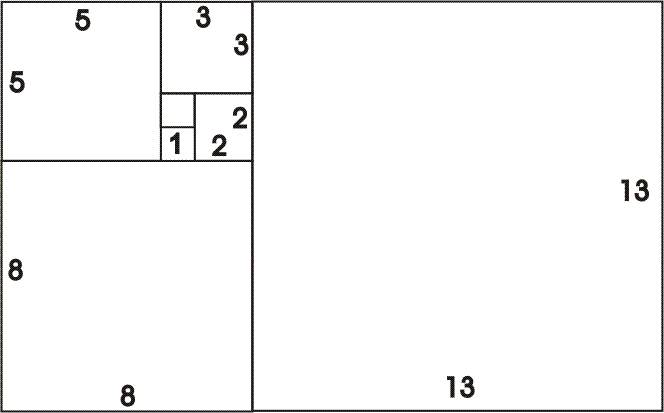 Si consideramos los números de la sucesión de Fibonacci, 1, 1, 2, 3, 5, 8, 13, ........y los tomamos de dos en dos 1, 1; 1, 2; 2, 3; 3, 5; 5, 8; 8, 13; .......podemos construir una colección de rectángulos cuyos lados vayan siendo consecutivamente 1 y 1; 1 y 2; 2 y 3; 3 y 5; 5 y 8; 8 y 13; 13 y 21 ; etc. Cada rectángulo de una generación se forma añadiendo un cuadrado al rectángulo de la generación precedente.